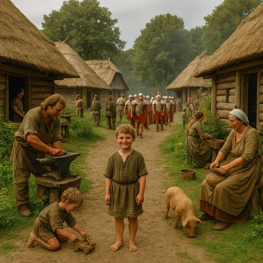 Der Sommer liegt schwer über den Hügeln, als die Kunde kommt: Drusus hat den Rhein überquert. Die Männer reden davon, seit Tagen, in den Höfen, am Feuer, im Wald. Ich höre zu, ohne dass sie es merken. Ich sitze am Rand der Hütte, den Kopf auf den Knien, und lausche. „Sie haben Brücken gebaut“, sagt einer. „Holz, Stein, schneller als wir es glauben können.“ „Sie ziehen Lager auf wie Dörfer“, sagt ein anderer. „Und wenn sie weiterziehen, bleibt nichts zurück außer Linien...