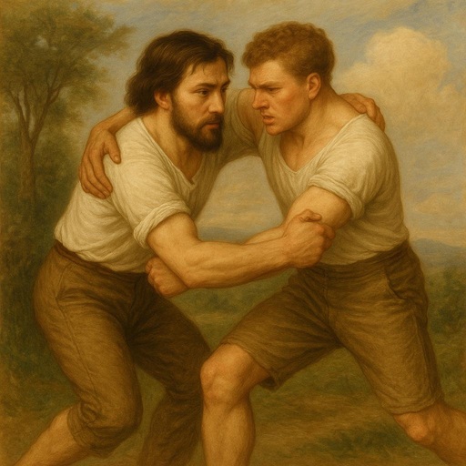 Der Morgennebel hing noch schwer über der Wiese, als zwei Gestalten in weißen Hemden und straffen Leinenhosen sich gegenseitig im Ringen maßen. Es war ein wuchtiges, aber kontrolliertes Kräftemessen – wie ein Tanz, bei dem niemand führte, aber beide wussten, was zu tun war. „Fester Stand, mein Freund! Sonst heb’ ich dich wie ein Sack Mehl über die Schulter!“, rief Jahn mit funkelnden Augen. Sein Kontrahent, ein jüngerer Mann mit zerzaustem Haar und rotem Kopf, japste: „Sprichst...
